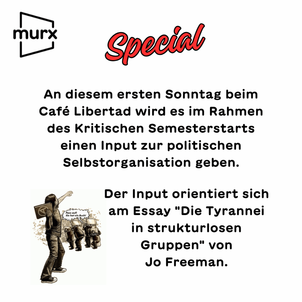 An diesem Sonntag gibt im Rahmen des Kritischen Semesterstarts zusätzlich einen von Jo Freemans Essay „Die Tyrannei in strukturlosen Gruppen“ inspirierten Input.