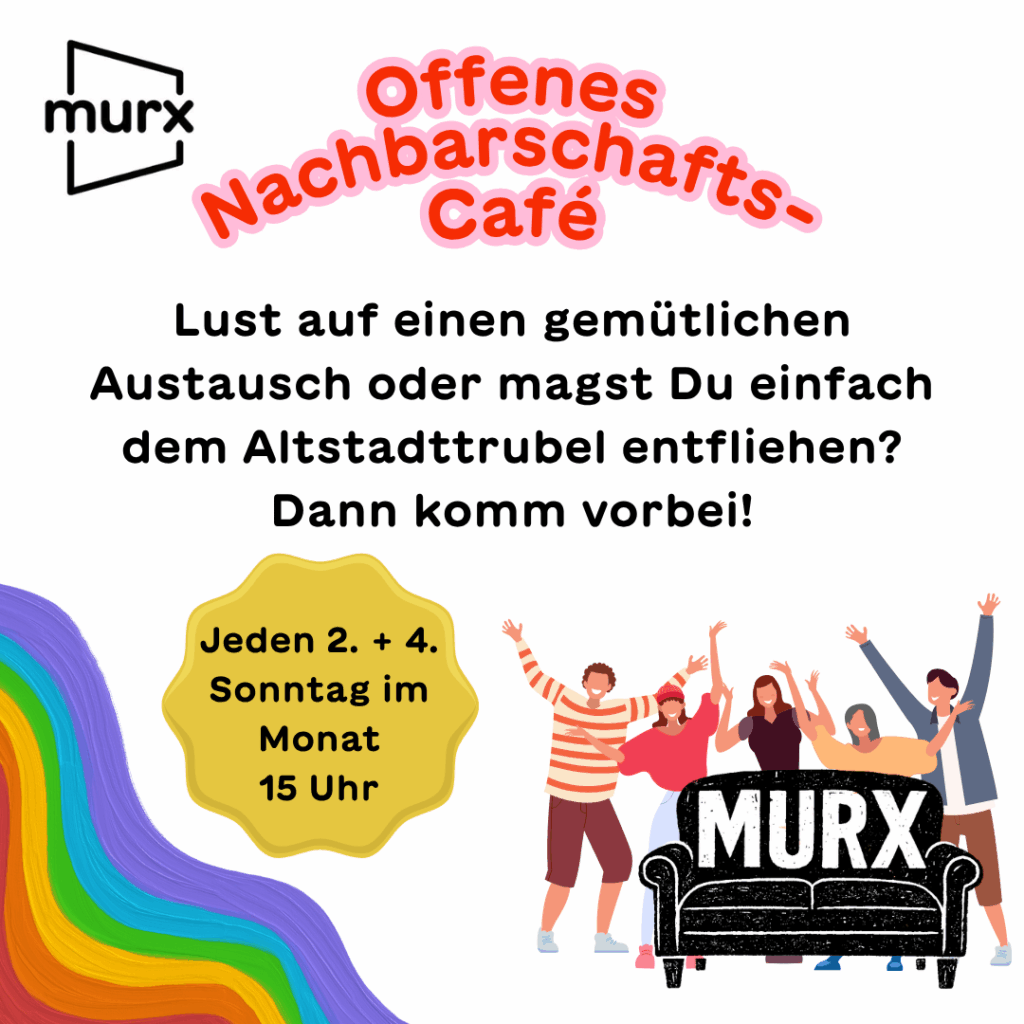 Das Offene Nachbarschafts-Café ist als Treffpunkt für Menschen aus der Nachbarschaft, aber auch für alle anderen die einen offenen Raum suchen gedacht Es findet immer am 2. und 4. Sonntag des Monats sowie am 2. Mittwoch des Monats zwischen 15:00 und 19:30 Uhr statt.